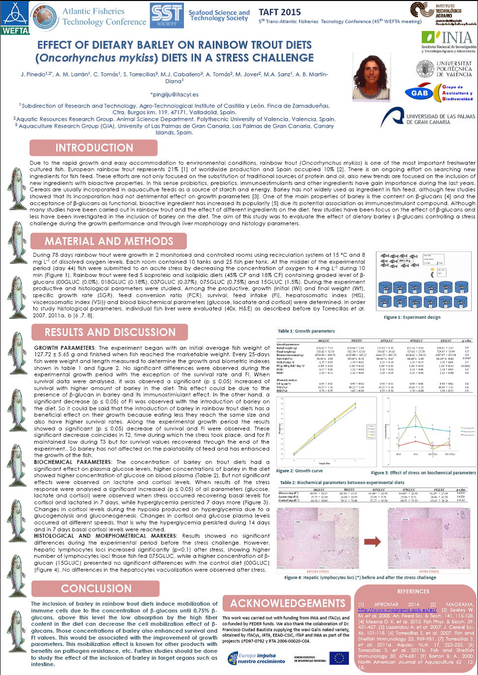 - "EFFECT OF DIETARY BARLEY ON RAINBOW TROUT DIETS ((Oncorhynchus mykiss) DIETS IN A STRESS CHALLENGE". 5 Th TRANS-ATLANTIC FISHERIES TECNOLOGY CONGERENCE (45 Th WEFTA Meeting), 12-16 OCTUBRE 2015 NANTES, FRANCIA